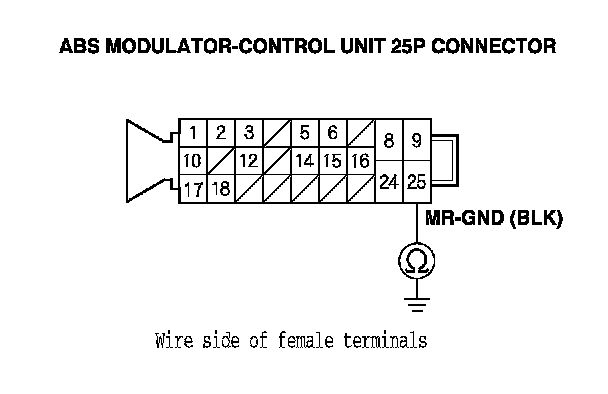 7. Check for continuity between ABS modulator-control unit 25P connector terminal No. 25 and body ground.