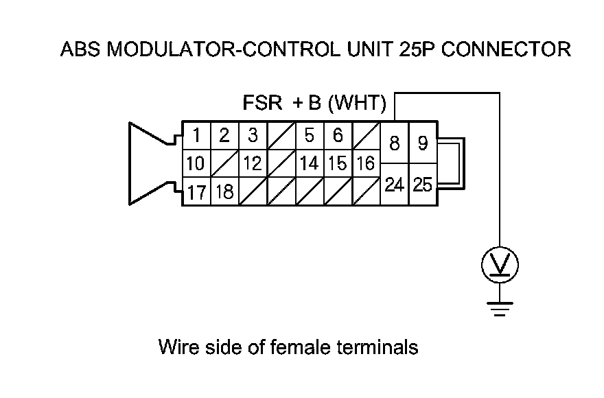 8. Check for continuity between ABS modulator-control unit 25P connector terminal No. 8 and body ground.
