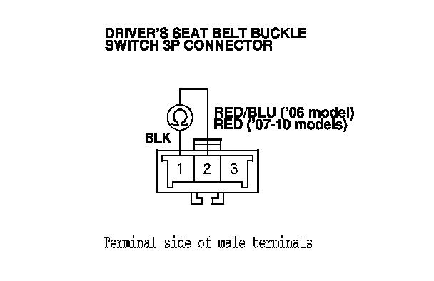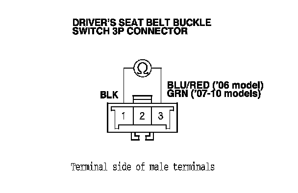 17. Measure the resistance between driver's seat belt buckle switch 3P connector terminals No. 1 and No. 2. There should be less than 1.0 Ohms.