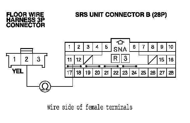 13. Measure the resistance between SRS unit connector B (28P) terminal No. 12 and floor wire harness 3P connector terminal No. 3. There should be less than 1.0 Ohms.
