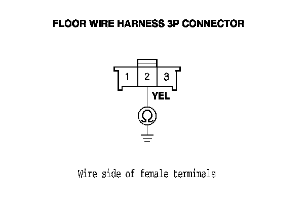 9. Measure the resistance between floor wire harness 3P connector terminal No. 1 and body ground. There should be less than 1.0 Ohms.
