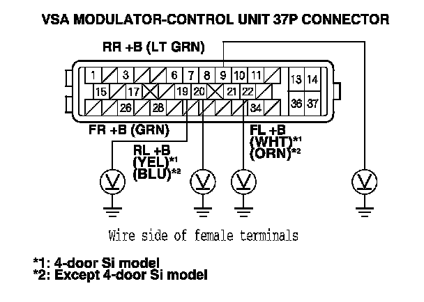 8. Measure the voltage between body ground and the appropriate VSA modulator-control unit 37P connector terminals (see table).