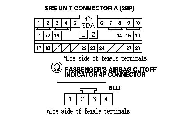 8. Measure the resistance between SRS unit connector A (28P) terminal No. 13 and passenger's airbag cutoff indicator 4P connector terminal No. 4. There should be less than 1.0 Ohms.