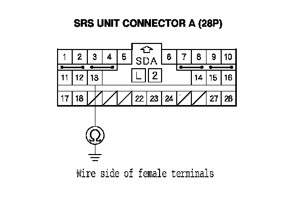 9. Measure the resistance between SRS unit connector A (28P) terminal No. 13 and body ground. There should be an open circuit or at least 1 MOhms.