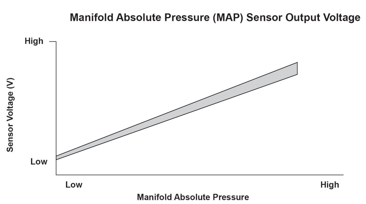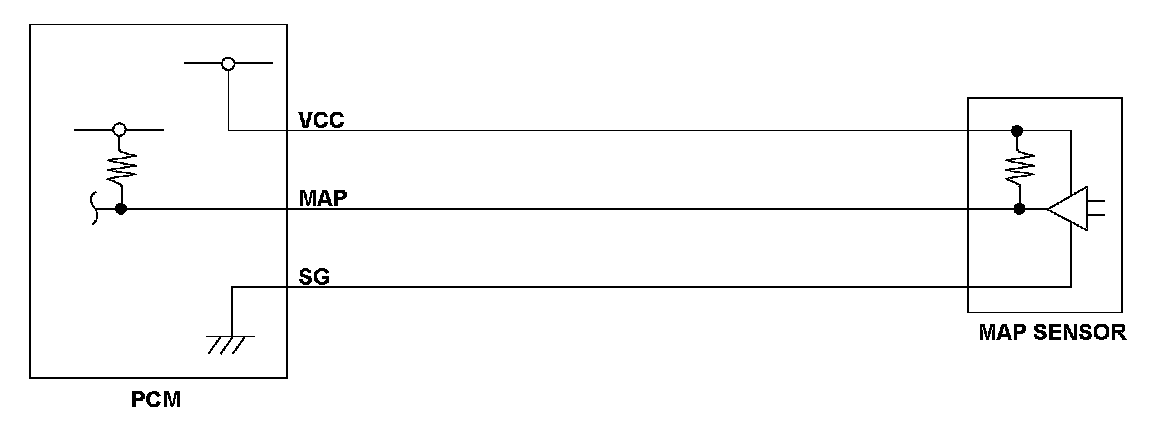 The manifold absolute pressure (MAP) sensor senses manifold absolute pressure (vacuum) and converts it into electrical signals. The MAP sensor outputs low signal voltage at high vacuum (throttle valve closed) and high signal voltage at low vacuum (throttle valve wide open). If the signal voltage from the MAP sensor is a set value, the powertrain control module (PCM) detects a malfunction and stores a DTC.