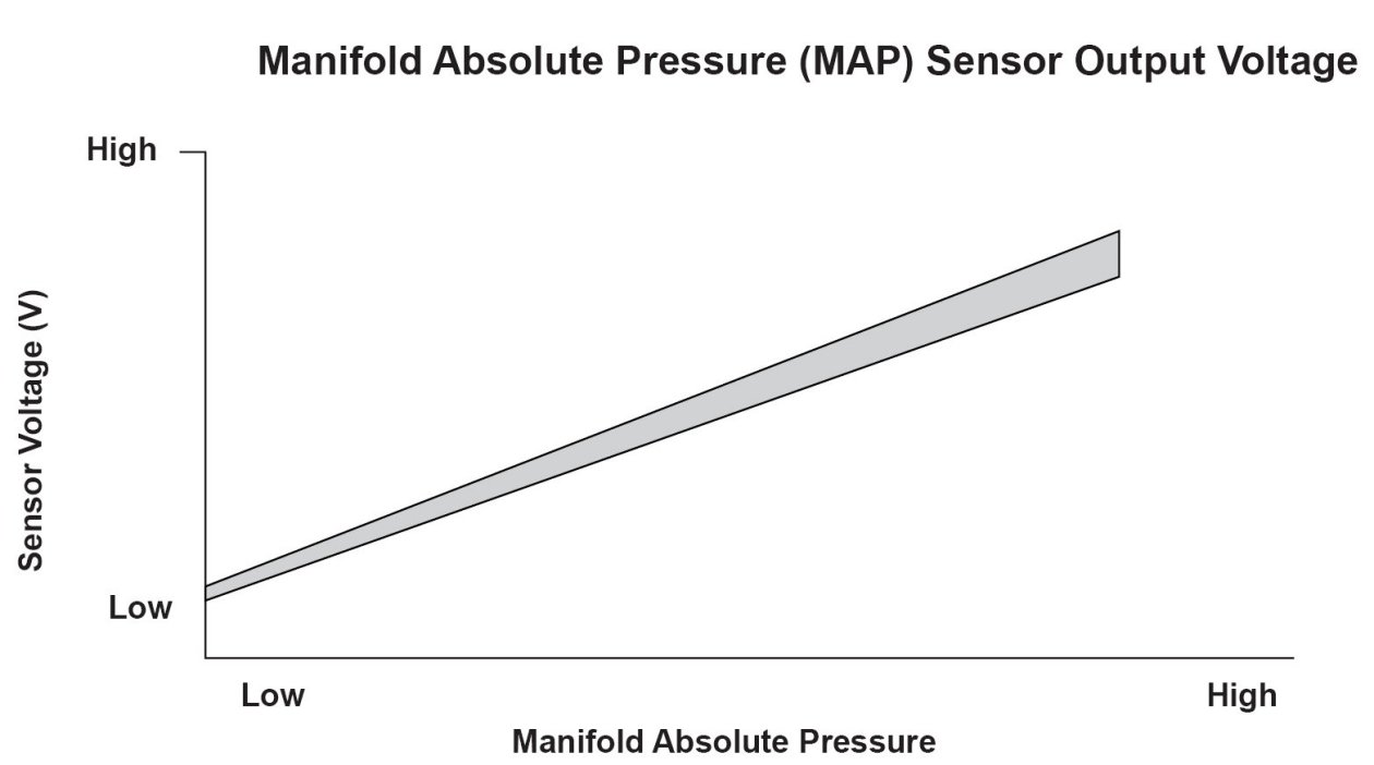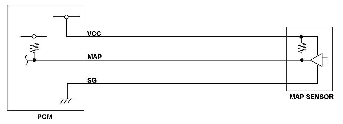 The manifold absolute pressure (MAP) sensor senses manifold absolute pressure (vacuum) and converts it into electrical signals. The MAP sensor outputs low signal voltage at high vacuum (throttle valve closed) and high signal voltage at low vacuum (throttle valve wide open). If the signal voltage from the MAP sensor is a set value, the powertrain control module (PCM) detects a malfunction and stores a DTC.