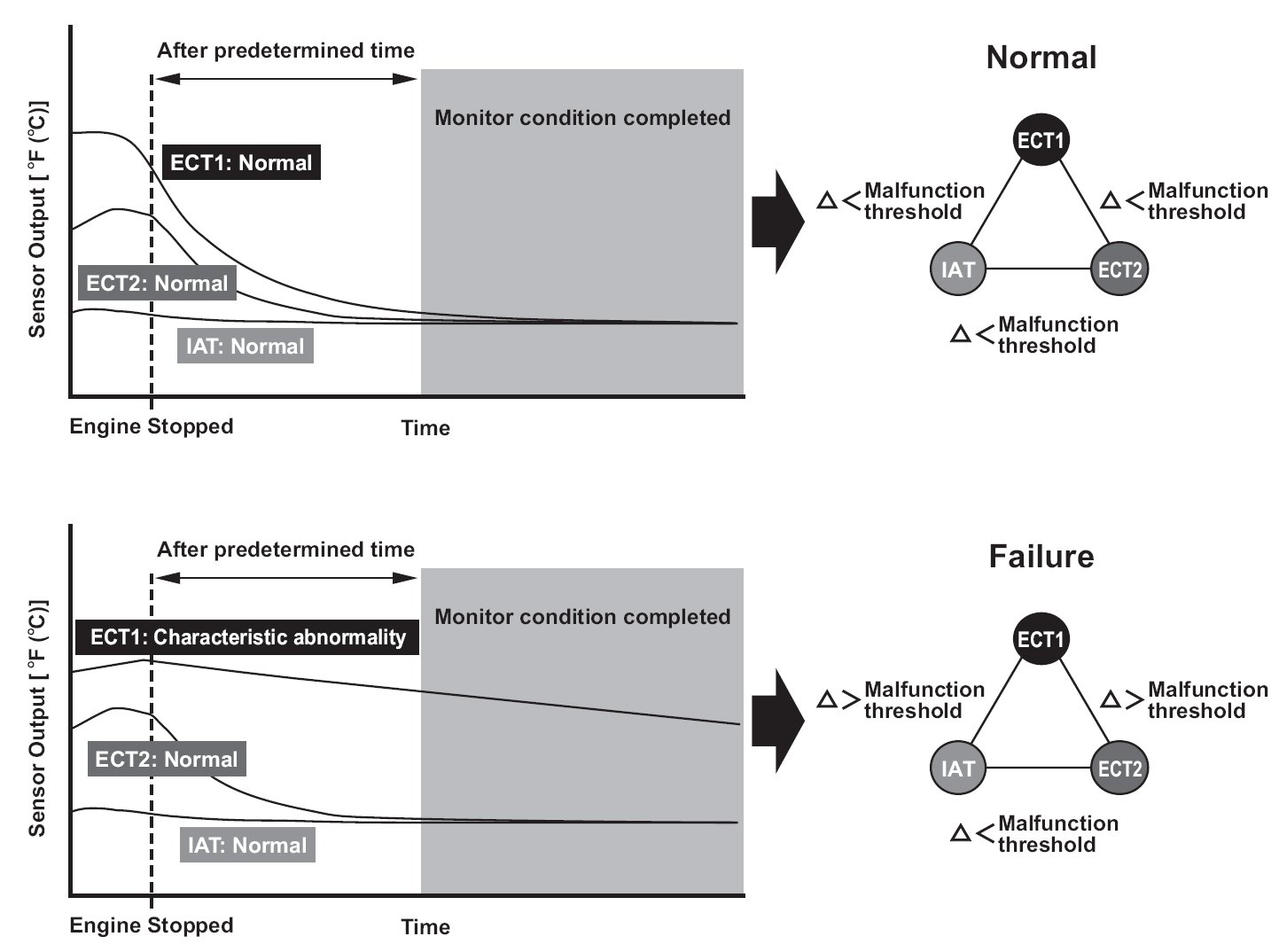 Two engine coolant temperature sensors and one intake air temperature sensor are used by the powertrain control module (PCM). When the engine is stopped and enough time has passed, the temperature of the engine will equalize to the ambient temperature. When an inappropriate temperature is detected after comparing the temperature readings of each sensor, the PCM detects a malfunction in the corresponding sensor and stores a DTC.