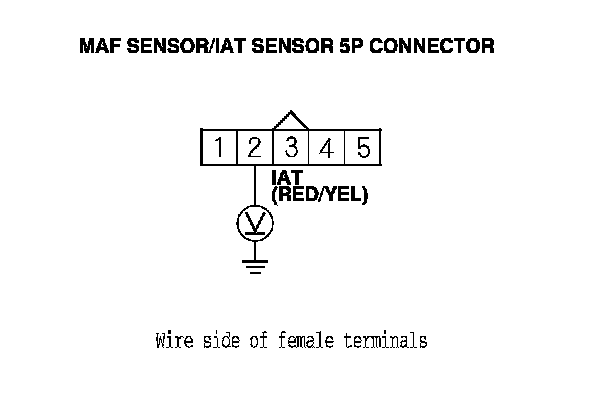 11. Measure the voltage between MAF sensor/IAT sensor 5P connector terminal No. 2 and body ground.