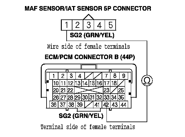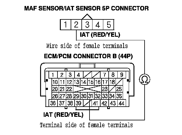 19. Check for continuity between MAF sensor/IAT sensor 5P connector terminal No. 2 and ECM/PCM connector terminal B31.