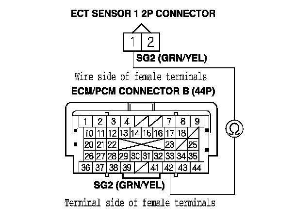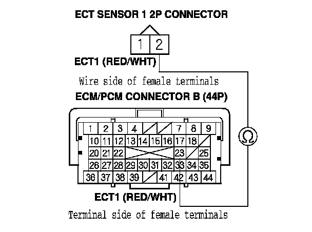 YES - Check for poor connections or loose terminals at ECT sensor 1 and the ECM/PCM, then go to step 1.