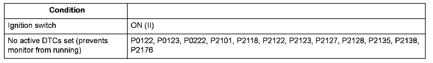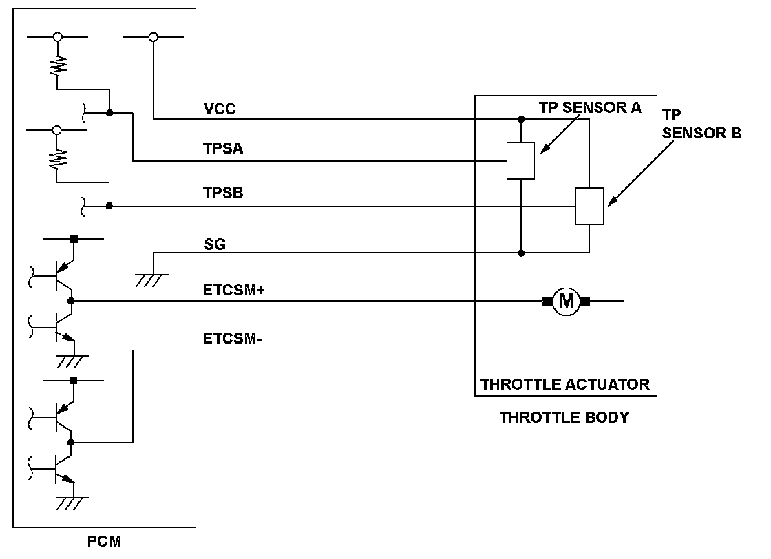 The electronic throttle control system controls the throttle valve opening. The system includes the throttle actuator, the throttle valve, throttle position (TP) sensors A and B, the electronic throttle control system (ETCS) control relay, the accelerator pedal position (APP) sensor, and the powertrain control module (PCM). TP sensor B is a semiconductor type, and it is attached to the throttle body and shaft to determine throttle valve position. The throttle valve position signal from TP sensor B is transmitted to the PCM for target position feedback control. If the signal from TP sensor B is a fixed value for a set time, the PCM detects a TP sensor B malfunction and stores a DTC.