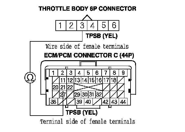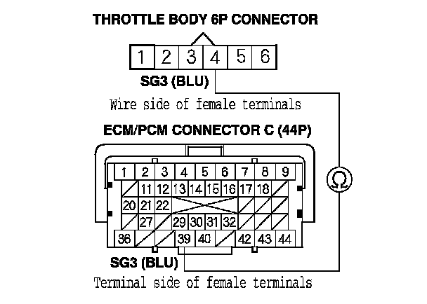17. Check for continuity between ECM/PCM connector terminal C39 and throttle body 6P connector terminal No. 4.