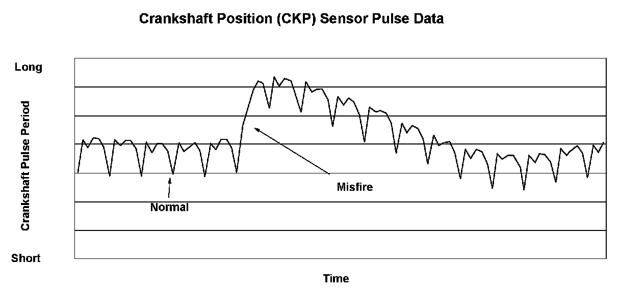 The crankshaft vibrates slightly when each cylinder fires. If a misfire occurs, the crankshaft rotation speed changes rapidly. The powertrain control module (PCM) monitors engine misfiring based on the output pulses from the crankshaft position (CKP) sensor, counts the number of misfires, and determines which cylinder is misfiring. If a misfire is detected, a DTC is stored. There are two types of misfire detection: