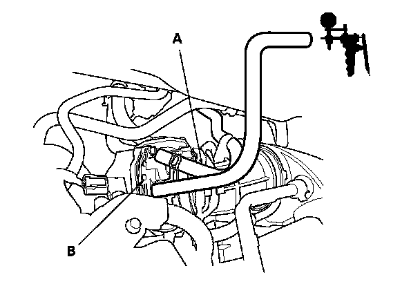 6. Disconnect the vacuum hose (A) from the EVAP canister purge valve (B) in the engine compartment, and connect a vacuum pump/gauge, 0-30 inHg, to the hose.