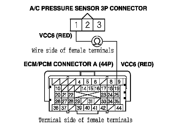 17. Check for continuity between A/C pressure sensor 3P connector terminal No. 1 and ECM/PCM connector terminal A19.