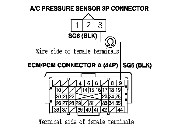 21. Check for continuity between A/C pressure sensor 3P connector terminal No. 3 and ECM/PCM connector terminal A9.