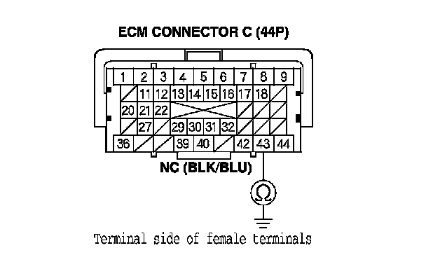 13. Check for continuity between ECM connector terminal C43 and body ground.