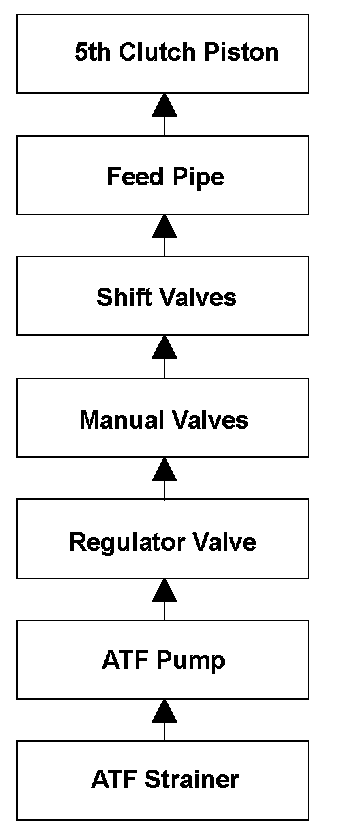 To engage 5th gear, line pressure is supplied to the 5th clutch piston, engaging the 5th clutch, and the mainshaft and the mainshaft 5th gear are connected and revolve together. Hydraulic pressure is supplied to the 5th clutch through the ATF strainer --> the ATF pump --> the regulator valve --> the manual valve --> the shift valves --> the feed pipe --> the 5th clutch piston. (A shift valve failure in the supply route above is detected by the malfunction detection of each shift solenoid valve.) The powertrain control module (PCM) computes the ratio of the input shaft (mainshaft) speed to the output shaft (countershaft) speed. When the ratio is not the 5th gear ratio, the PCM detects a malfunction of the hydraulic circuit or the 5th clutch, and stores a DTC.
