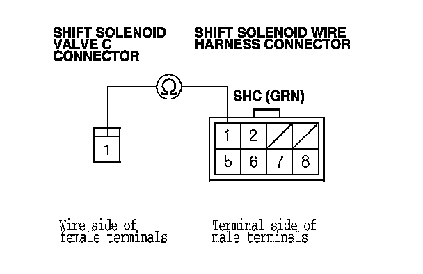 15. Check for continuity between shift solenoid wire harness connector terminal No. 1 and the shift solenoid valve C connector terminal.