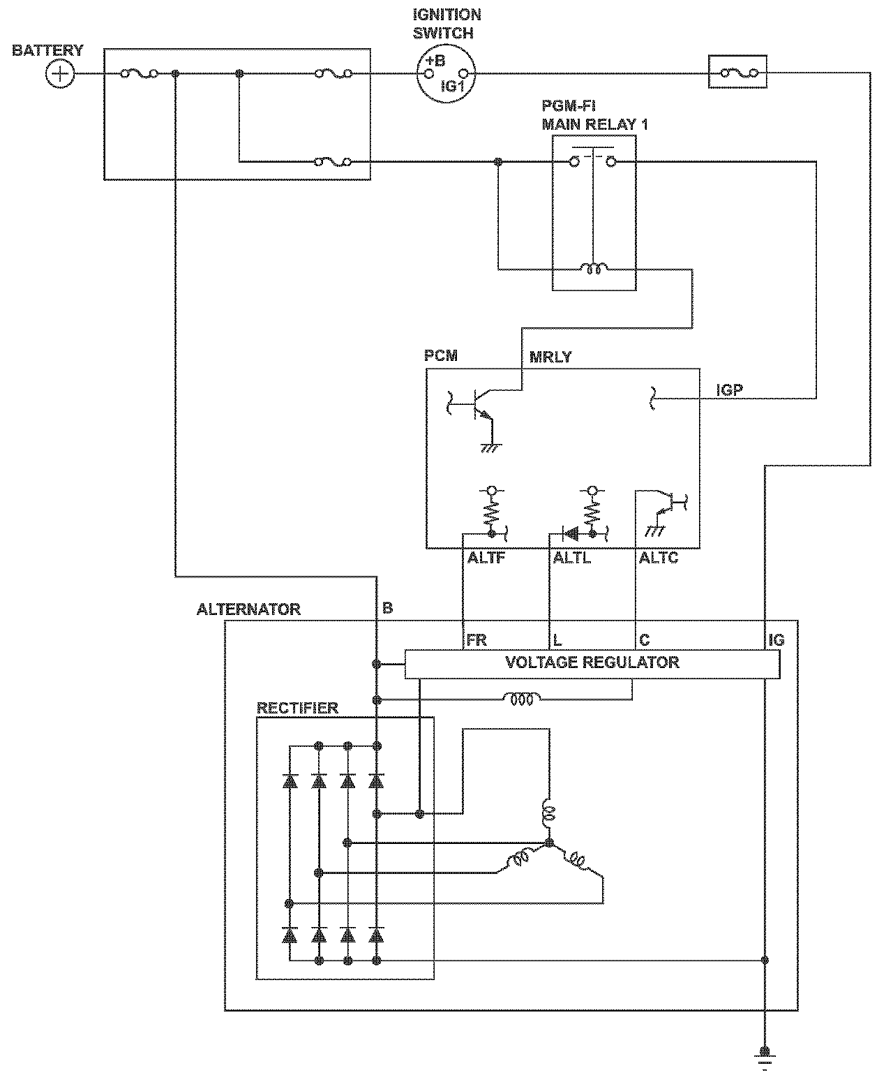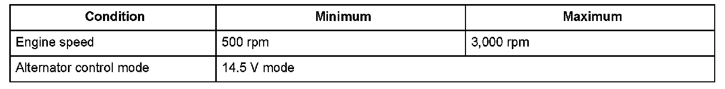 The alternator is driven by the engine, and it generates electricity to supply the necessary power to the electrical system and to charge the battery. The alternator voltage target values of 14.5 V and 12.5 V are achieved by switching the alternator control mode (controlled by the powertrain control module (PCM)). The alternator output signal is sent to the PCM, and it varies according to the battery's state of charge, the electrical load, and the engine speed. When the engine speed is a specified value and the IGP terminal voltage is below a set value when the alternator is in the 14.5 V mode, and the alternator power generation amount is a set range, and this condition continues for a set time, the PCM detects a malfunction and stores a DTC.