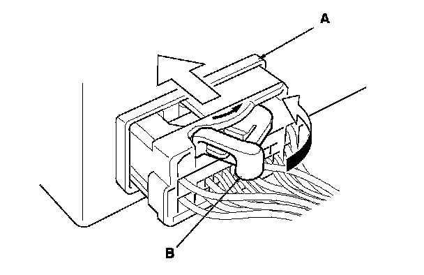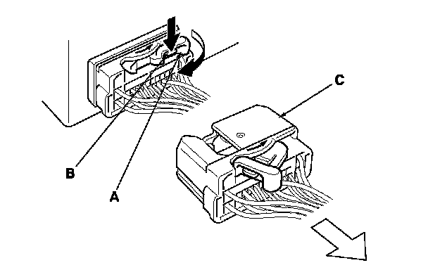 To disconnect the connector, pull the lever (A) while pushing the lock tab (B) down, then pull the connector (C).