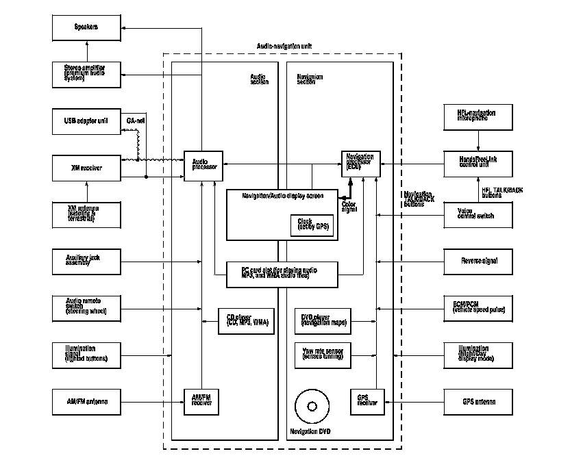 The internal GA-Net II bus passes information back and forth between the navigation display, the audio-navigation unit, and the audio system components. The information passed on this bus are touch button commands, audio muting signal, audio (radio and XM), and any open in these bus lines can affect the navigation system or other audio accessory operation.