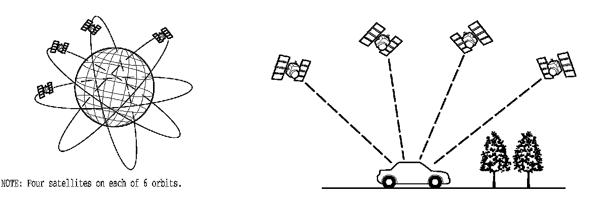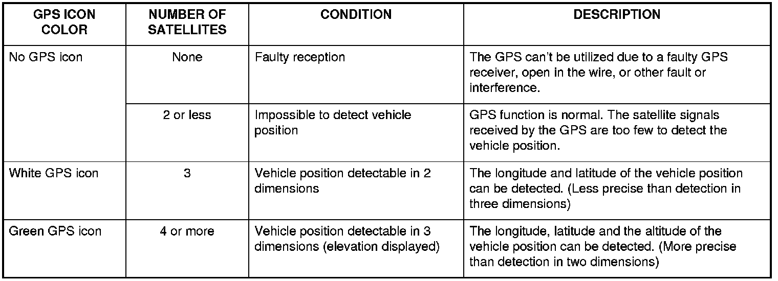 The global positioning system (GPS) enables the navigation system to determine the current position of the vehicle by using the signals transmitted from the satellites in orbit around the earth. The satellites transmit the satellite identification signal, orbit information, transmission time signal, and other information. When the GPS receiver receives a signal from four or more satellites simultaneously, it calculates the current position of the vehicle based on the distance to each satellite and the satellite's position in its respective orbit.