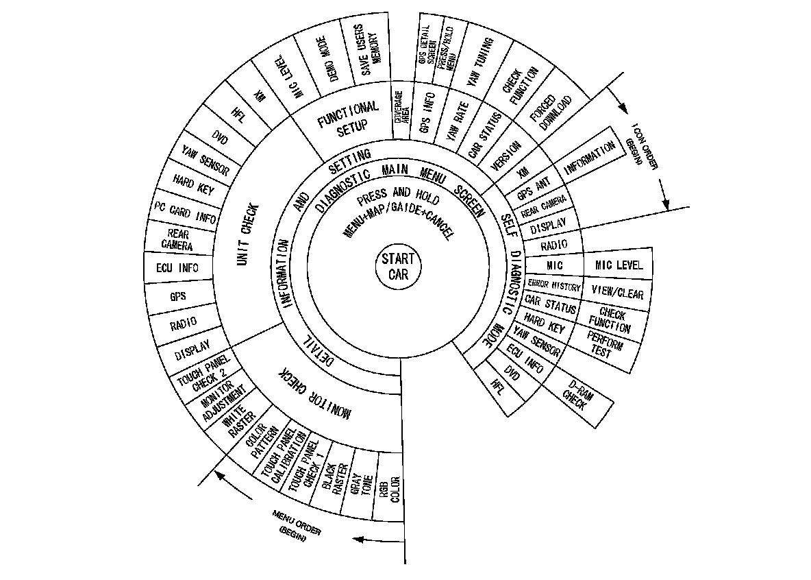 Access to the diagnostic features begins by starting the vehicle. This is necessary so the system can check the other systems connected by various busses. After starting the vehicle you can enter the diagnostic mode either by pressing and holding MENU, MAP/GUIDE, and CANCEL.