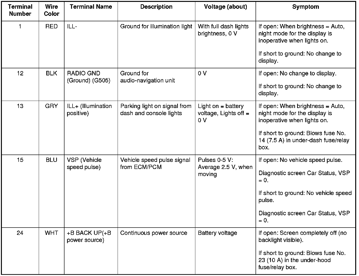 The illumination signal is used by the audio-navigation unit to automatically switch the display mode between the Night and Day display modes. When the headlights are on, the dash brightness control setting full brightness overrides the Night display mode, and allows a daytime navigation display with the lights on.