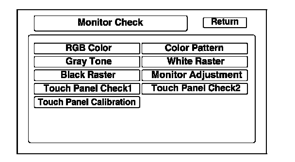 This screen verifies that the display unit is receiving the video (R, G, B and Composite sync) signals properly. The three primary colors should all appear without distortion. The combination of all three should produce a central white section. If the picture has lines in it, or scrolls horizontally or vertically, and any of the colors are missing, troubleshoot for a composite sync and color signal problem. Symptom Troubleshooting