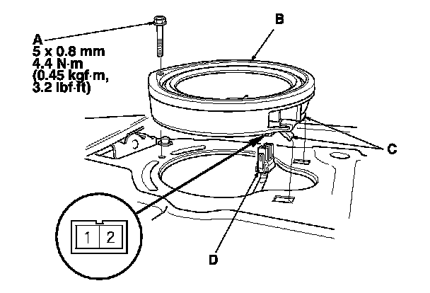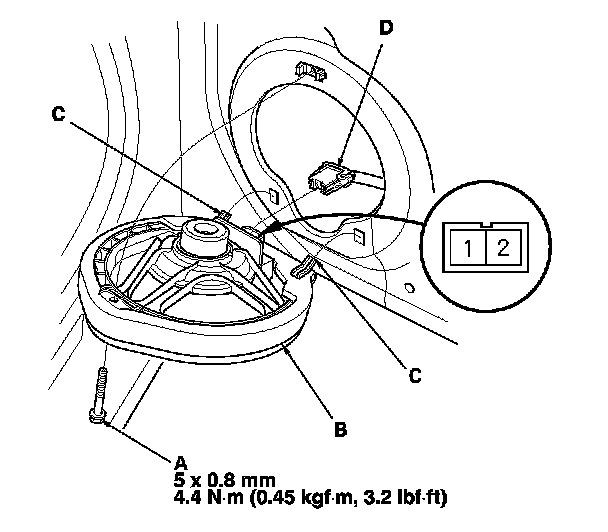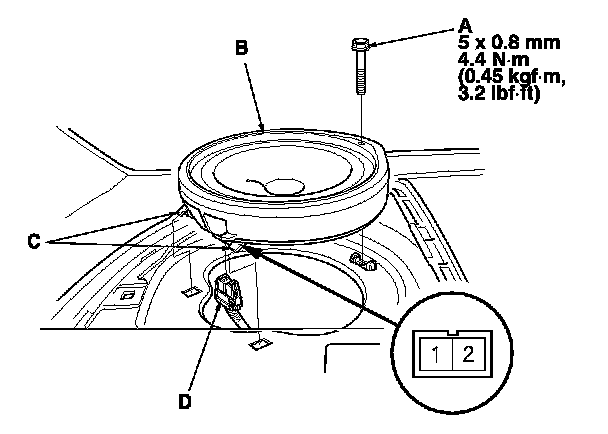 3. Disconnect the 2P connector (D), and remove the speaker.