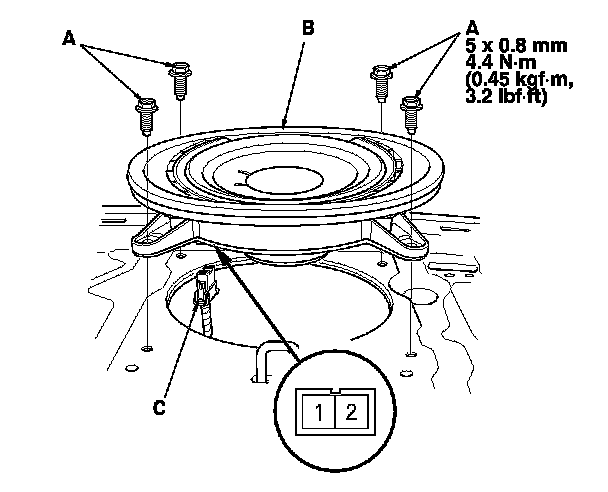2. Remove the bolt (A). Then lift the speaker (B) straight up to release the clips (C).