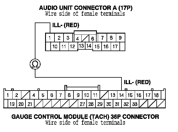 8. Check for continuity between audio unit connector A (17P) terminal No. 1 and gauge control module (tach) 36P connector terminal No. 14.
