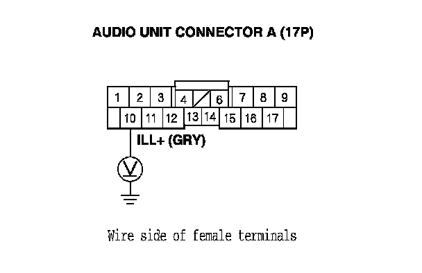 10. With the headlight switch still on, measure the voltage between audio unit connector A (17P) terminal No. 10 and body ground.