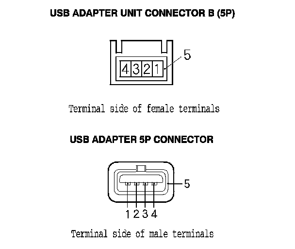 9. Check for continuity between terminals of USB adapter connector B (5P) and the USB adapter 5P connector according to the table.