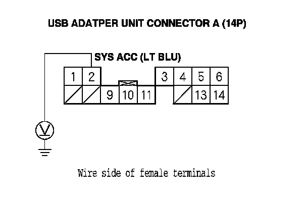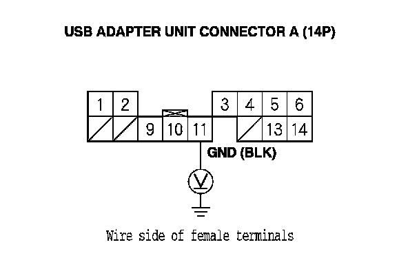 12. Measure the voltage between body ground and USB adapter unit connector A (14P) terminal No. 1.