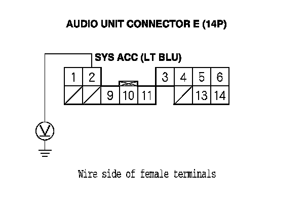 17. Measure the voltage between body ground and audio unit connector E (14P) terminal No. 2.