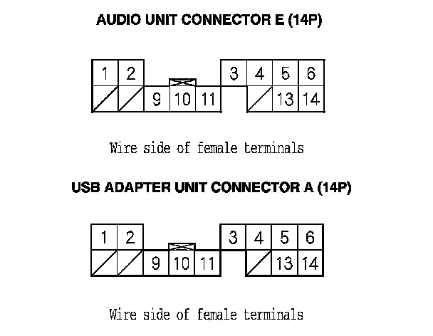 24. Check for continuity between the terminals of audio unit connector E (14P) and USB adapter unit connector A (14P) according to the table.