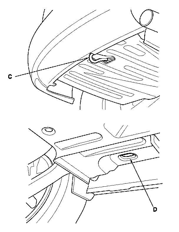 To accommodate the flat-bed tow truck equipment, the vehicle is equipped with front towing hooks (A), front tie down hook slots (B), a rear towing hook (C), and rear tie down hook slots (D).
