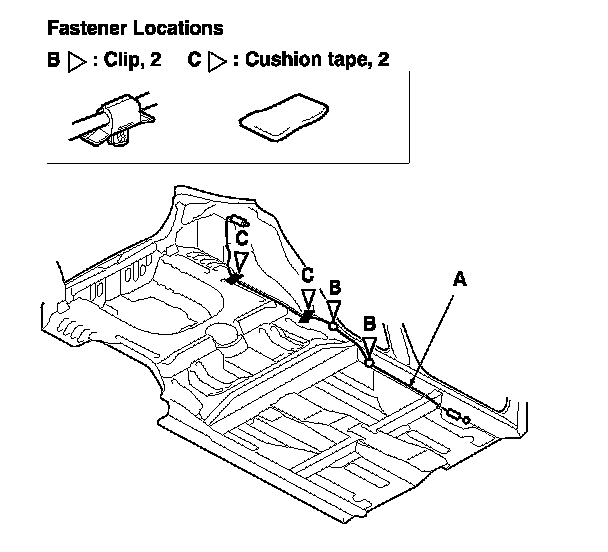 3. Release the opener cable (A) from the clips (B). Remove the cushion tapes (C).