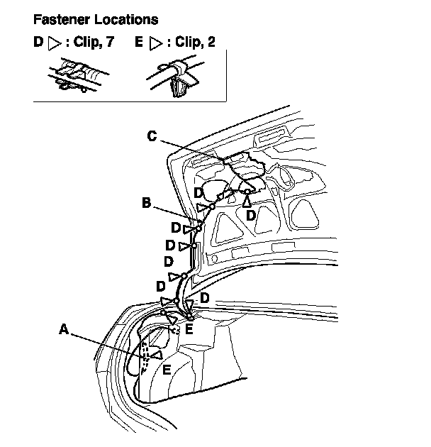 9. Release the trunk lid opener cable/fuel fill door opener cable from the clips (D), and detach the clips (E).