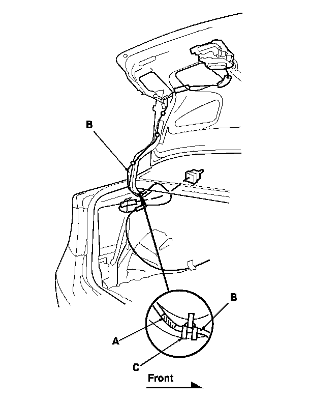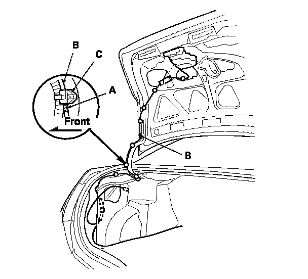 8. Disconnect the trunk lid opener cable (B) from the trunk lid latch (C). Service and Repair