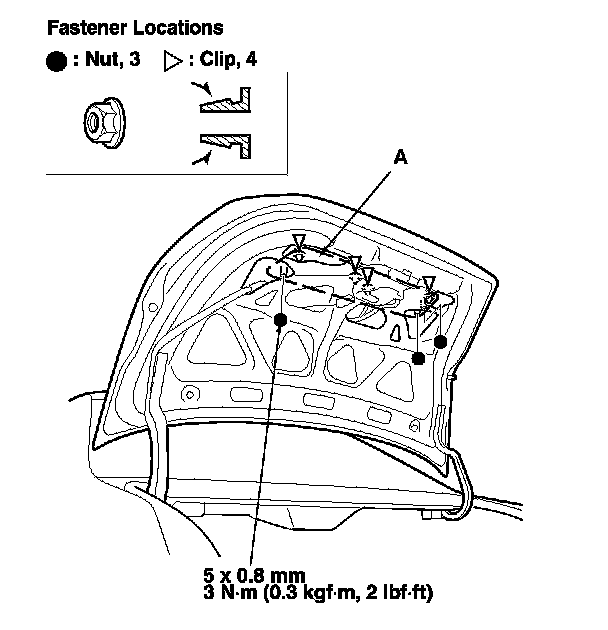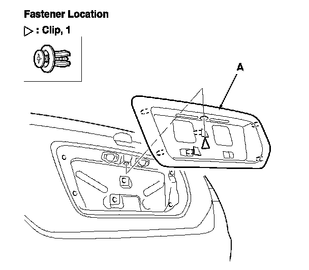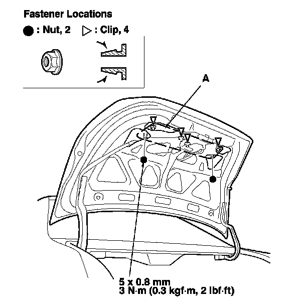1. From inside the trunk lid, remove the nuts securing the rear license trim (A), and push out the clips.