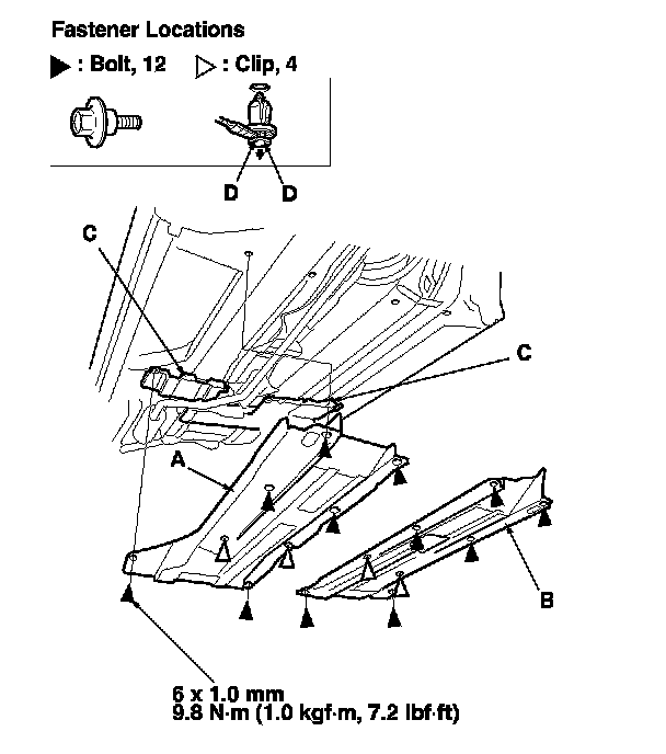 1. Remove the bolts, and detach the clips, then remove the right front floor undercover (A) and the left front floor undercover (B) from the middle floor undercovers (C).