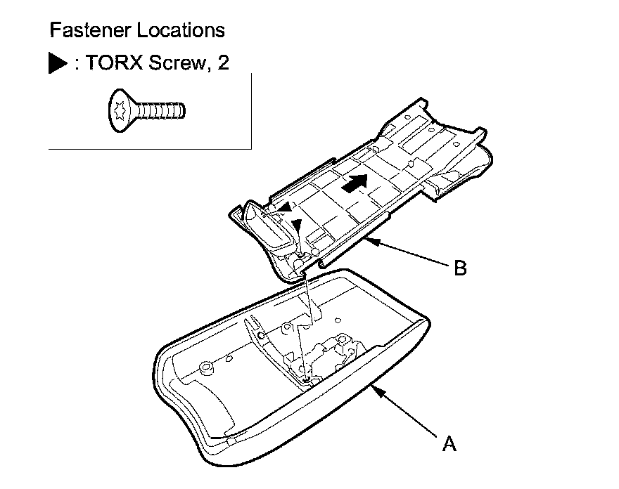 4. Slide the armrest (A) all the way forward, remove the TORX screws with a TORX T15 bit, then remove the armrest frame (B).