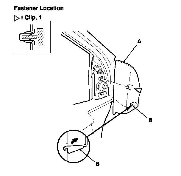 5. While holding the power mirror (A), squeeze the retaining tabs (B), then push out to remove the mirror.