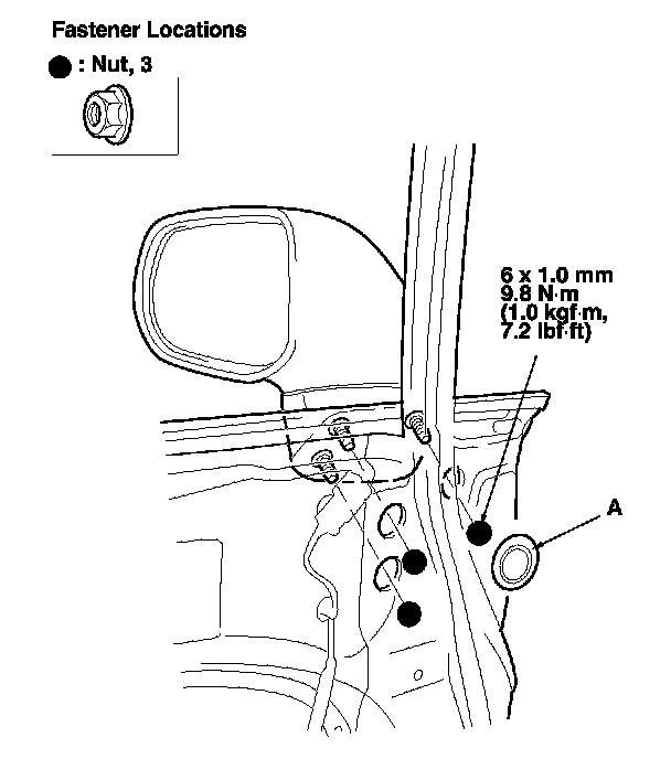 2. Disconnect the power mirror connector (A), and detach the harness clip (B).