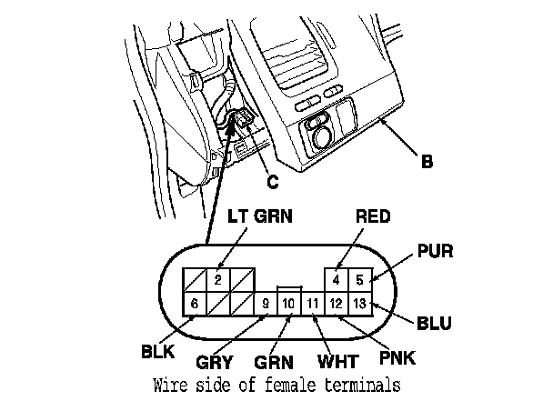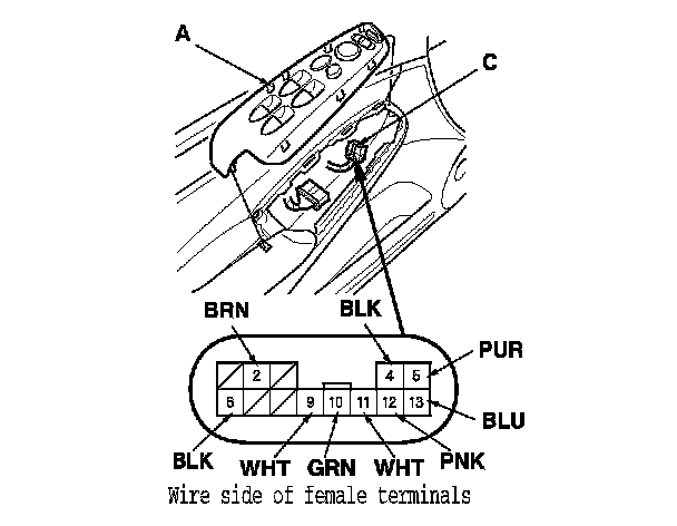 2. Disconnect the 13P connector (C) from the power mirror switch.