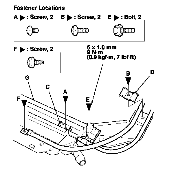 3. Remove the screws (A, B) securing the slide stops (C) and the cable tube rear brackets (D), the cable tube side bracket mounting bolts (E) and the cable tube mounting screws (F) from both sides of the frame (G).