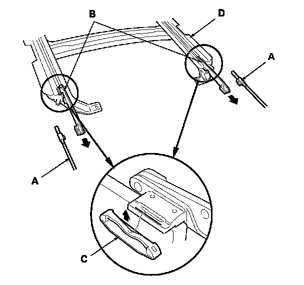 4. Turn both cable tube side brackets (A) up to release the hooks (B) from the holes in both sides of the frame.